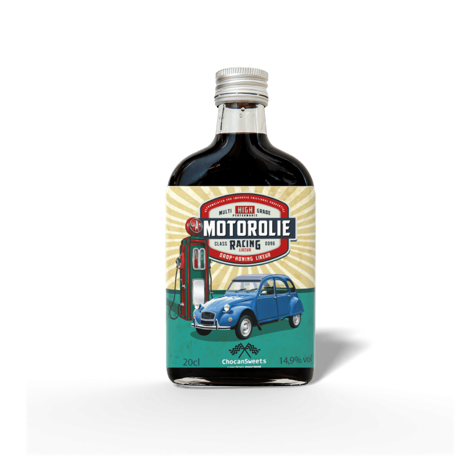 Onze retro serie likorettes in zakflacon. De benamingen en smaken van de verschillende varianten zijn een knipoog naar de diverse autovloeistoffen.