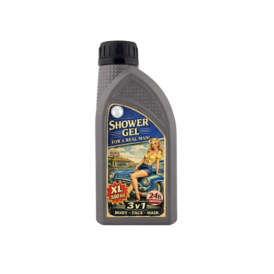 Deze retro industriële douchegel voor mannen valt meteen op. De stoere fles in de stijl van een bus motorolie, het pin-up etiket en de no-nonsense 3-in-1 formule maken dit geen gewone douchegel, dit is een statement in de badkamer.