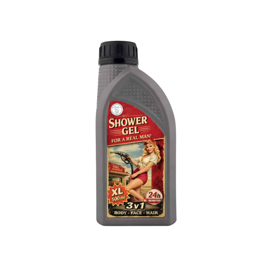 Deze retro industriële douchegel voor mannen valt meteen op. De stoere fles in de stijl van een bus motorolie, het pin-up etiket en de no-nonsense 3-in-1 formule maken dit geen gewone douchegel, dit is een statement in de badkamer.